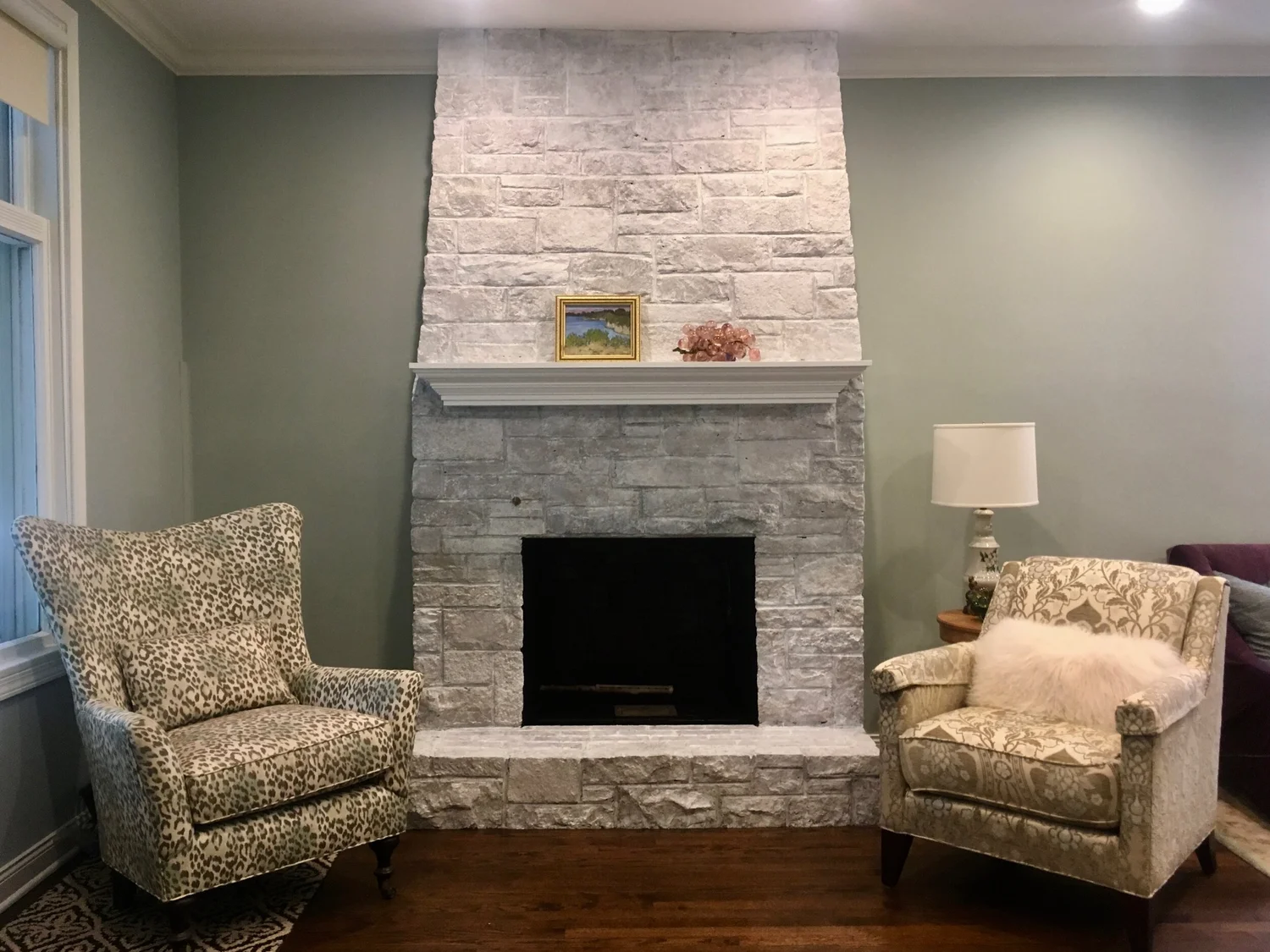 Intended to be a focal point and separation between two parts of the house, the fireplace wall was covered in rag-off technique using darker tones of the wall color. The size of the fireplace commands attention. The use of toned-down yellow blends i
